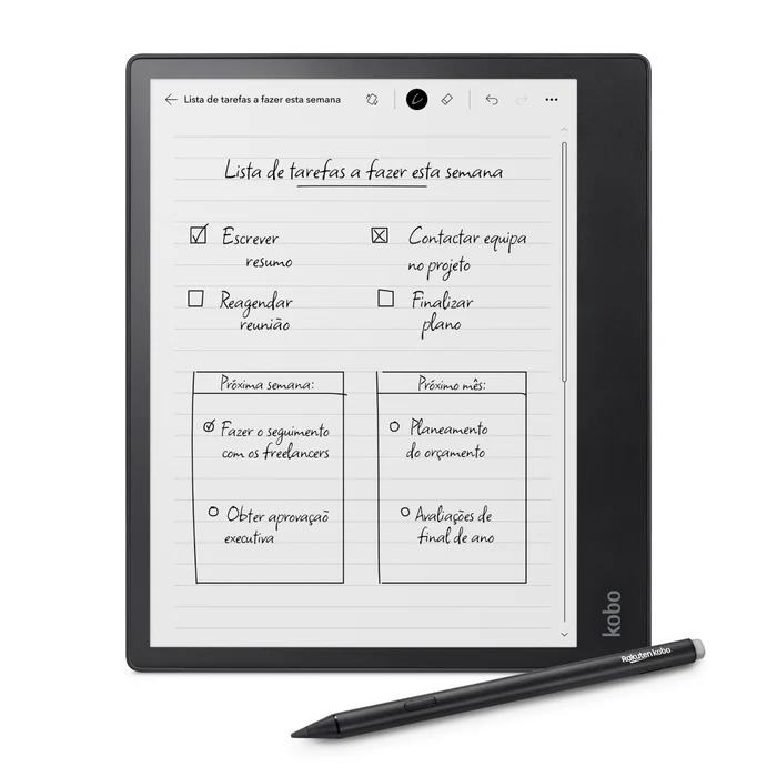 O premium para ler e anotar. E Ink Carta 1200 de 10,3″ · 227 PPI · Kobo Stylus 2 incluída · 32 GB · ComfortLight PRO · Bluetooth · WiFi dual band · 85% plástico reciclado.