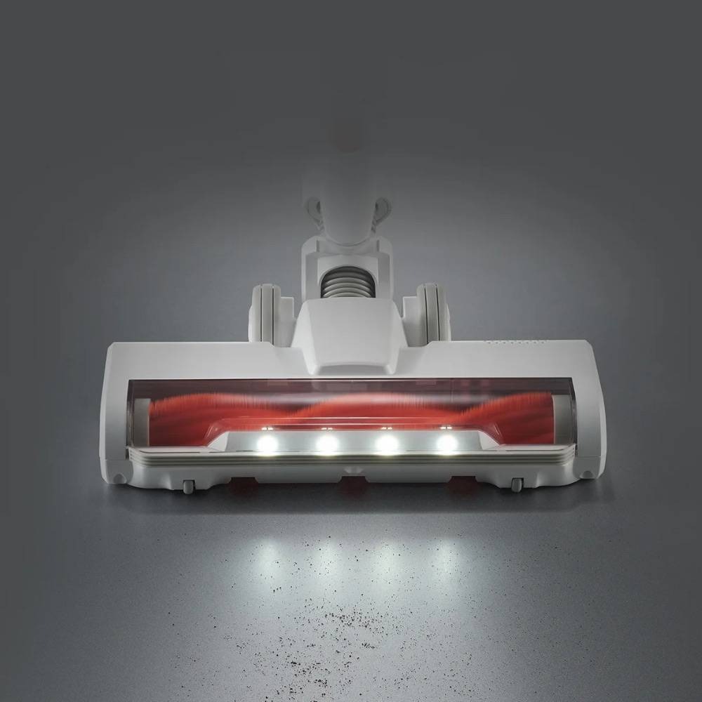 LED branco frontal ilumina zonas escuras revelando pó escondido em cantos, sob móveis e frestas. Tecnologia de detecção visual torna limpeza mais eficiente e completa mesmo em áreas com pouca luz.